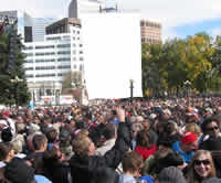广场敬仰个性制作:在一个大大的广场上,聚集中大量的民众,人山人海,挤得广场水泻不通,在中间搭建着一个大大的视频显示屏,所以在场的民众,都在崇拜,敬仰,支持,赞美着台上的人物,这个人物马上就出来了,他就是你上传的人物图片